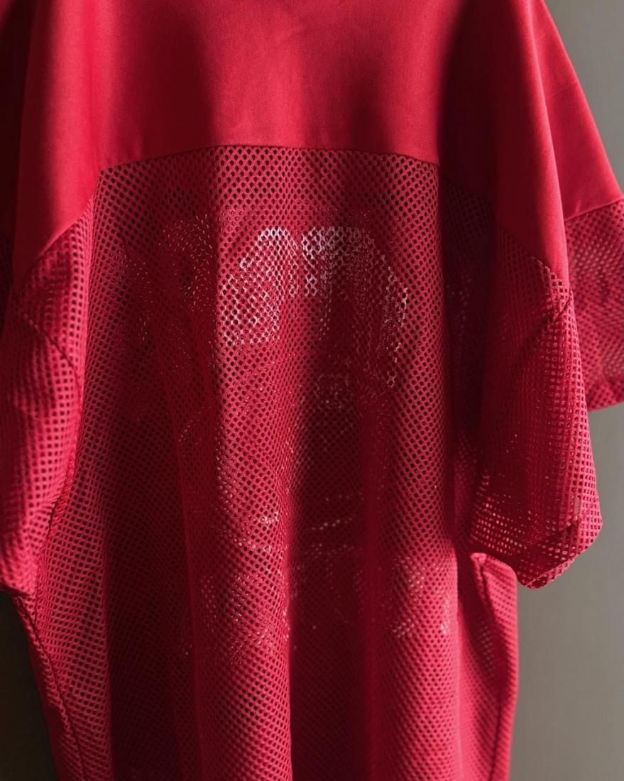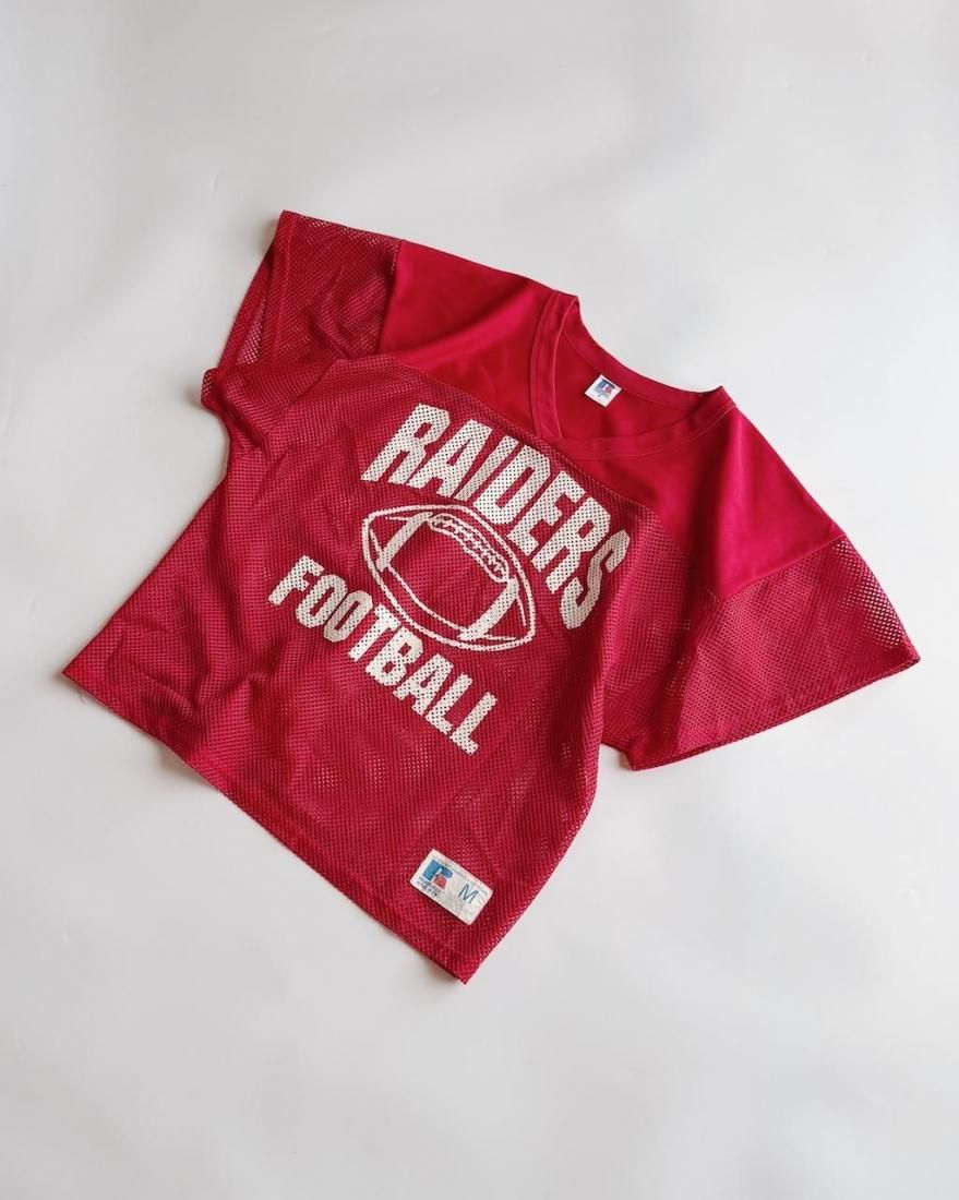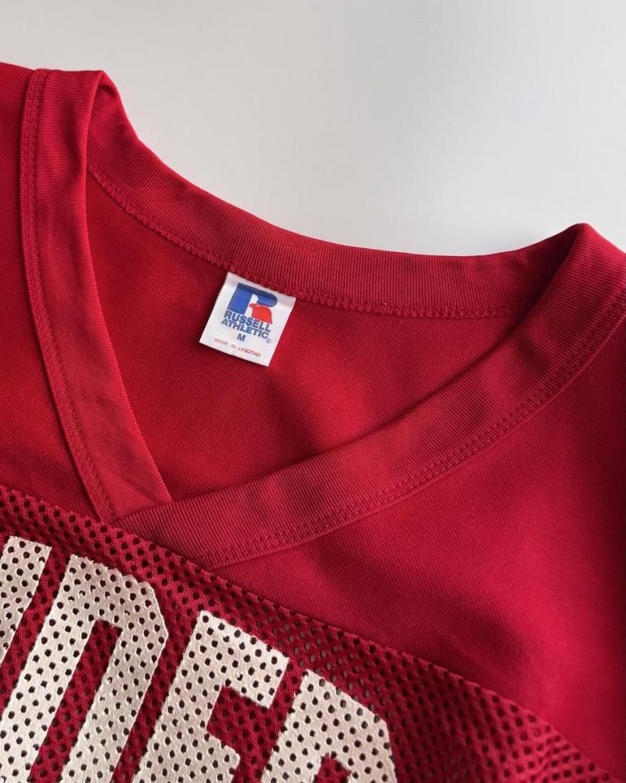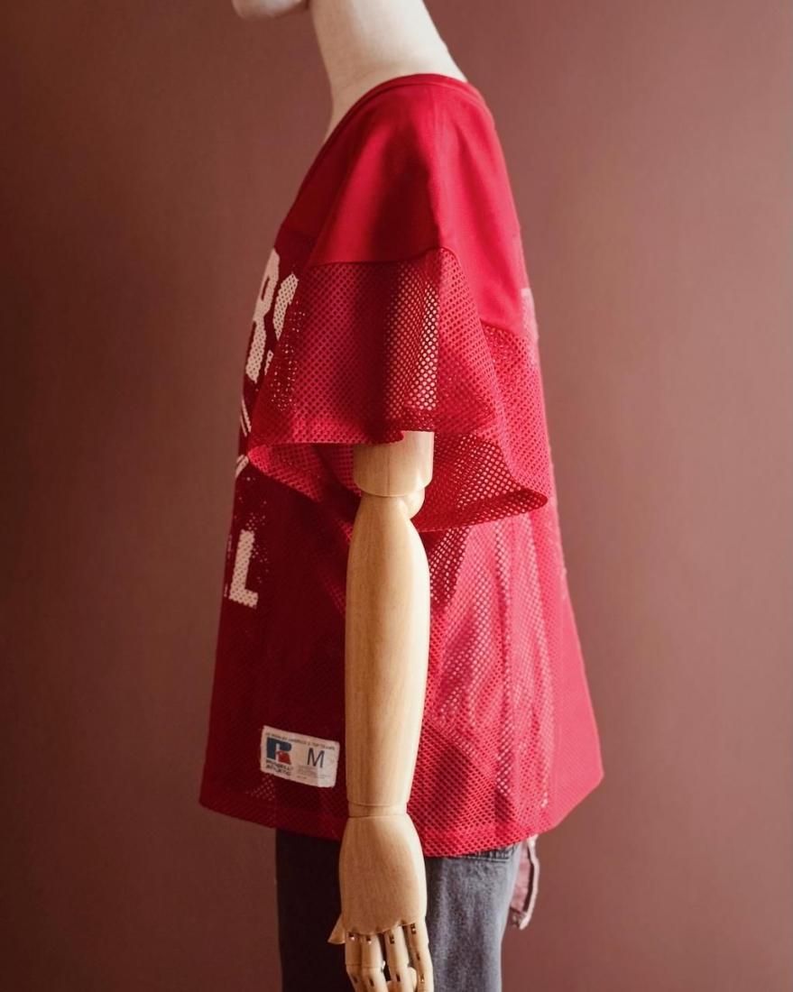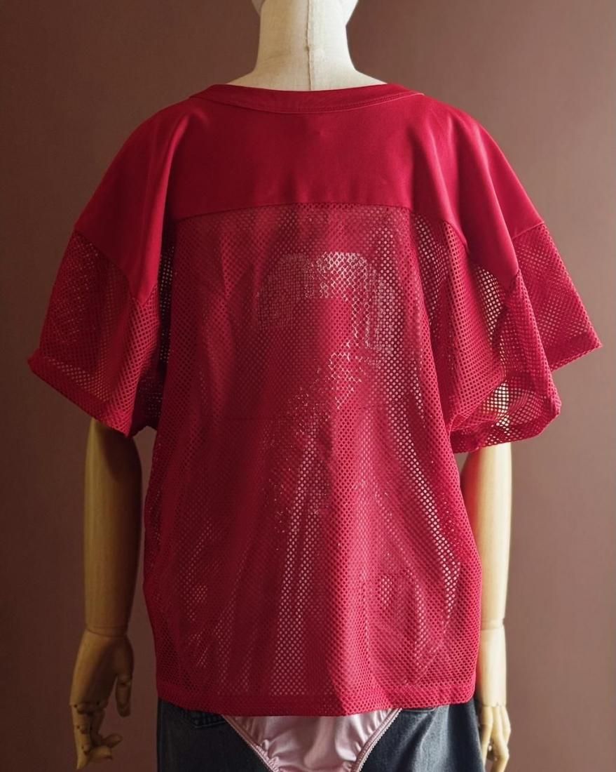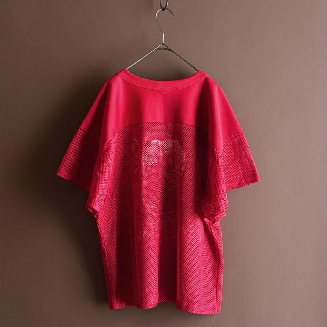 赤にホワイトのフットボールプリントが可愛いメッシュタイプのゲームシャツ。