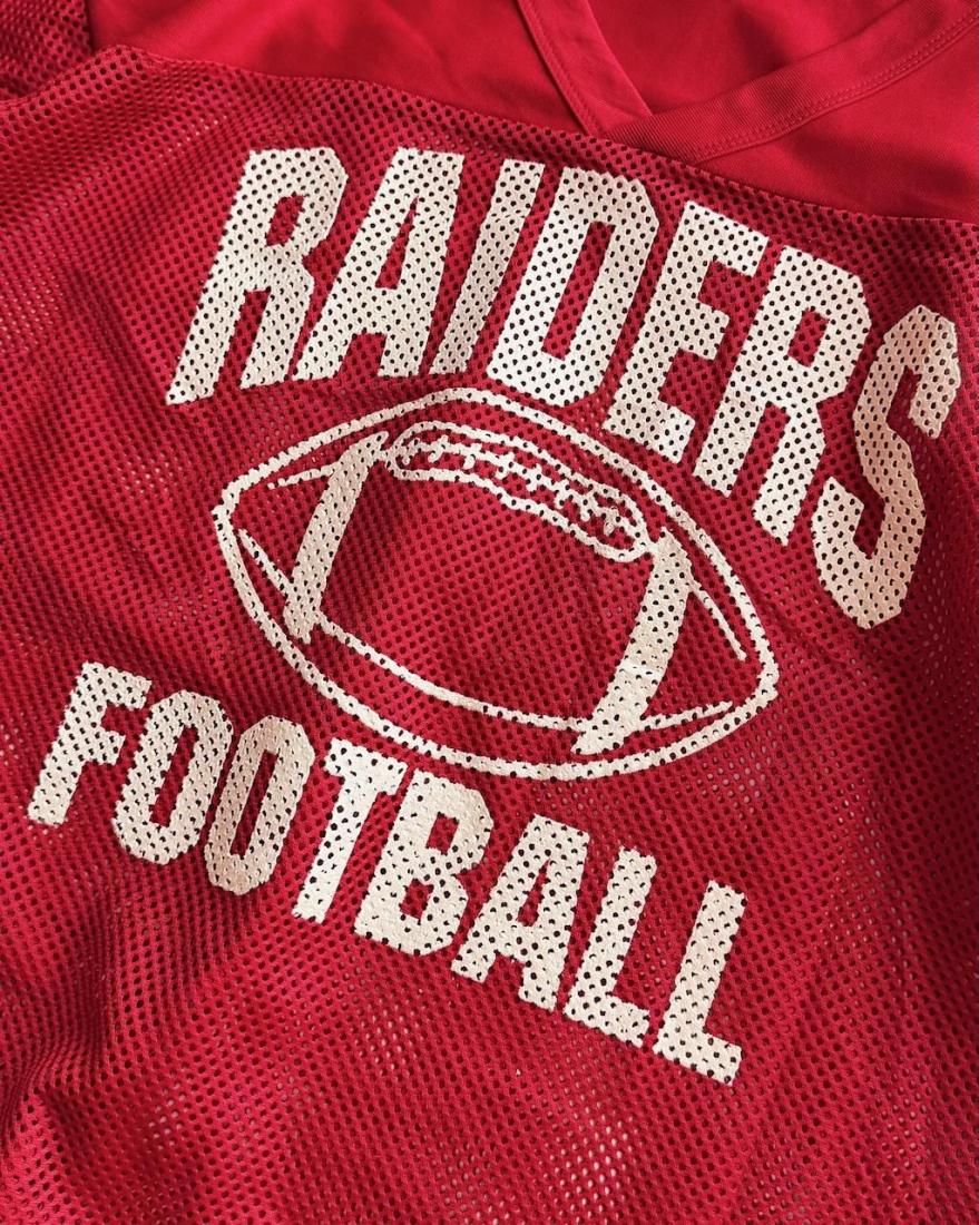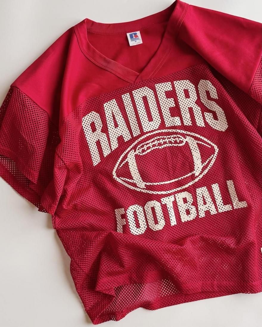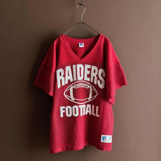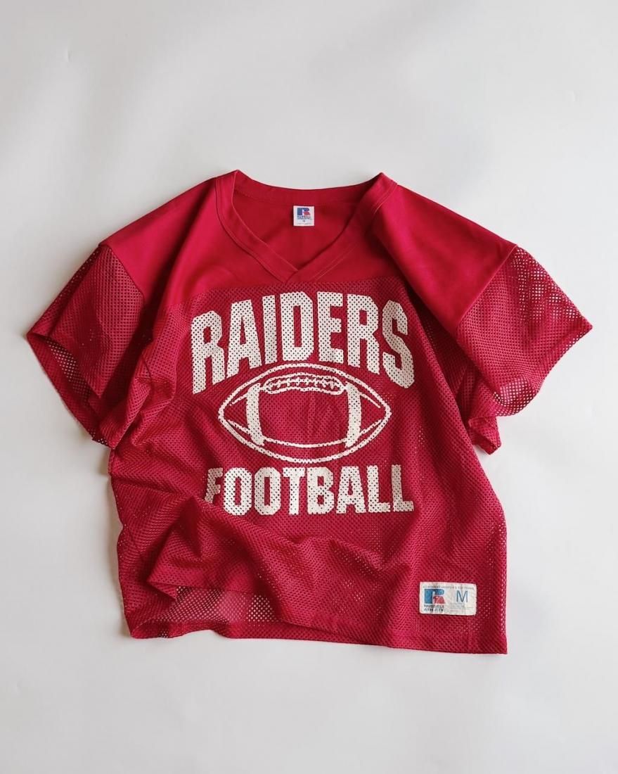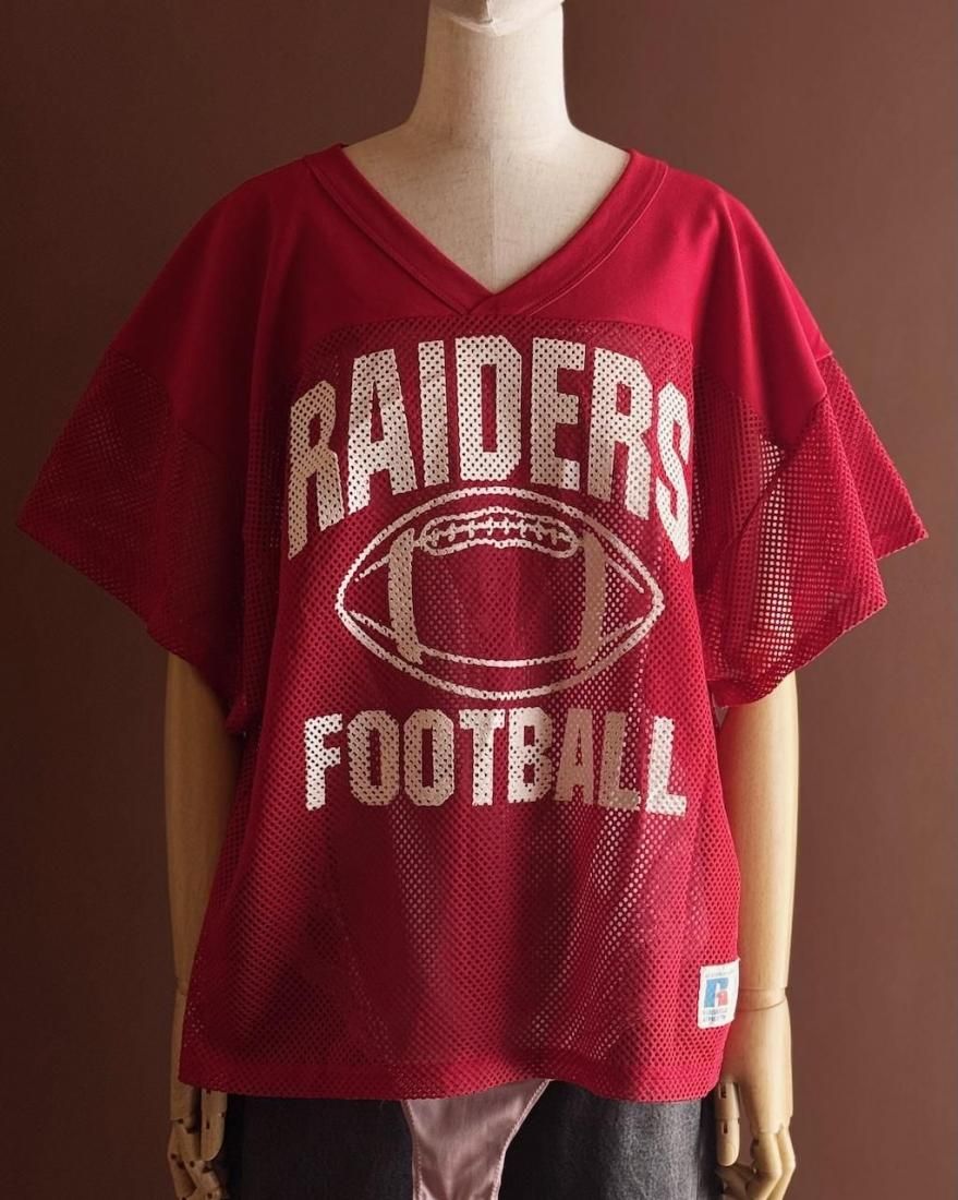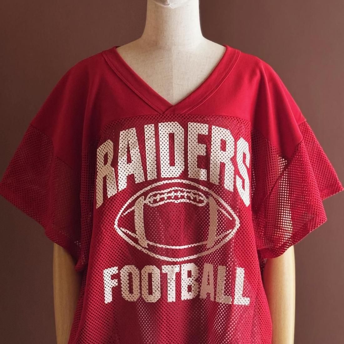 赤にホワイトのフットボールプリントが可愛いメッシュタイプのゲームシャツ。