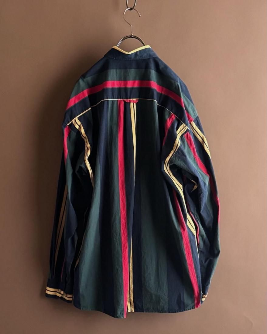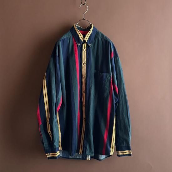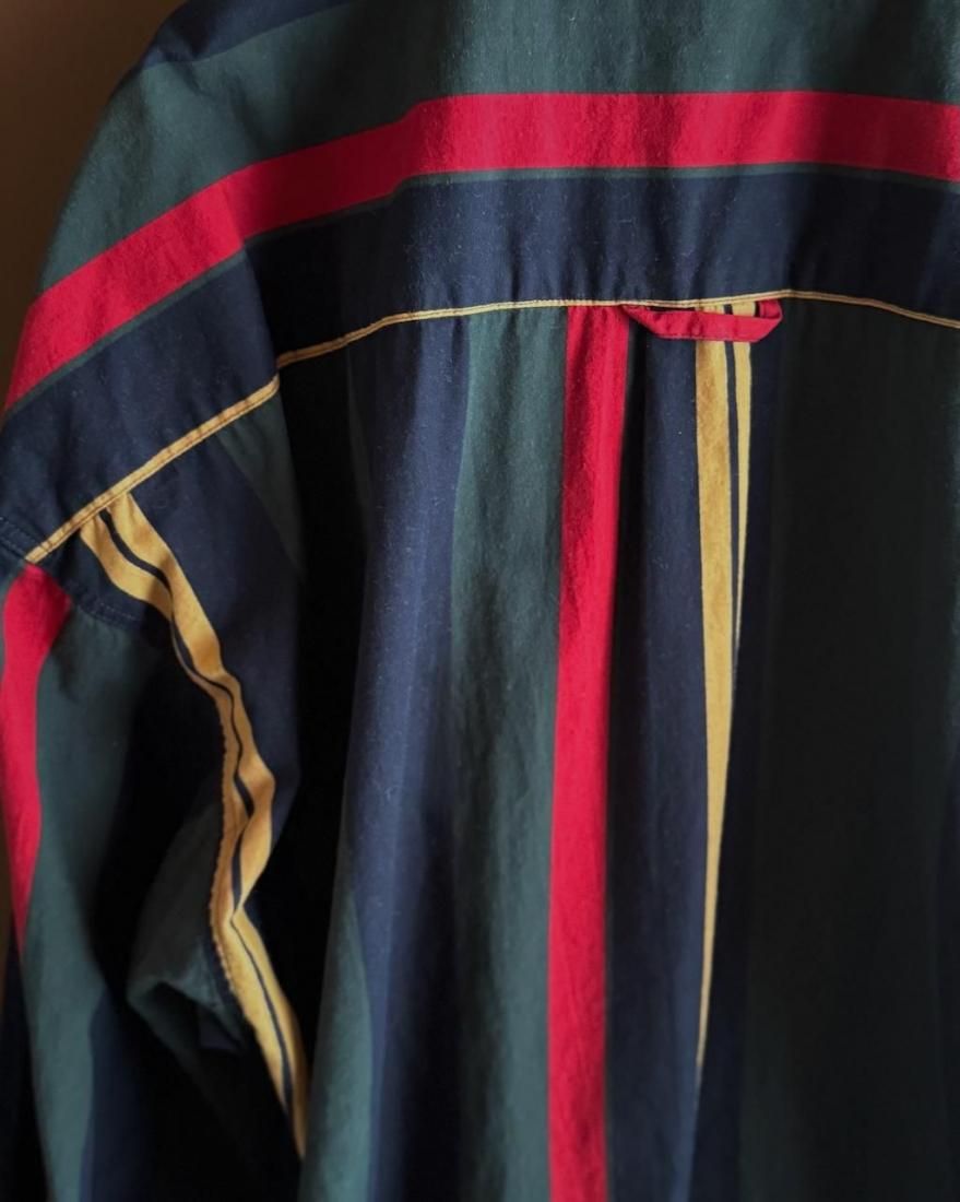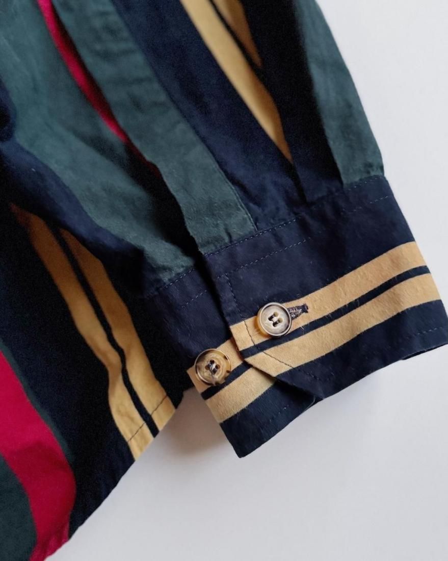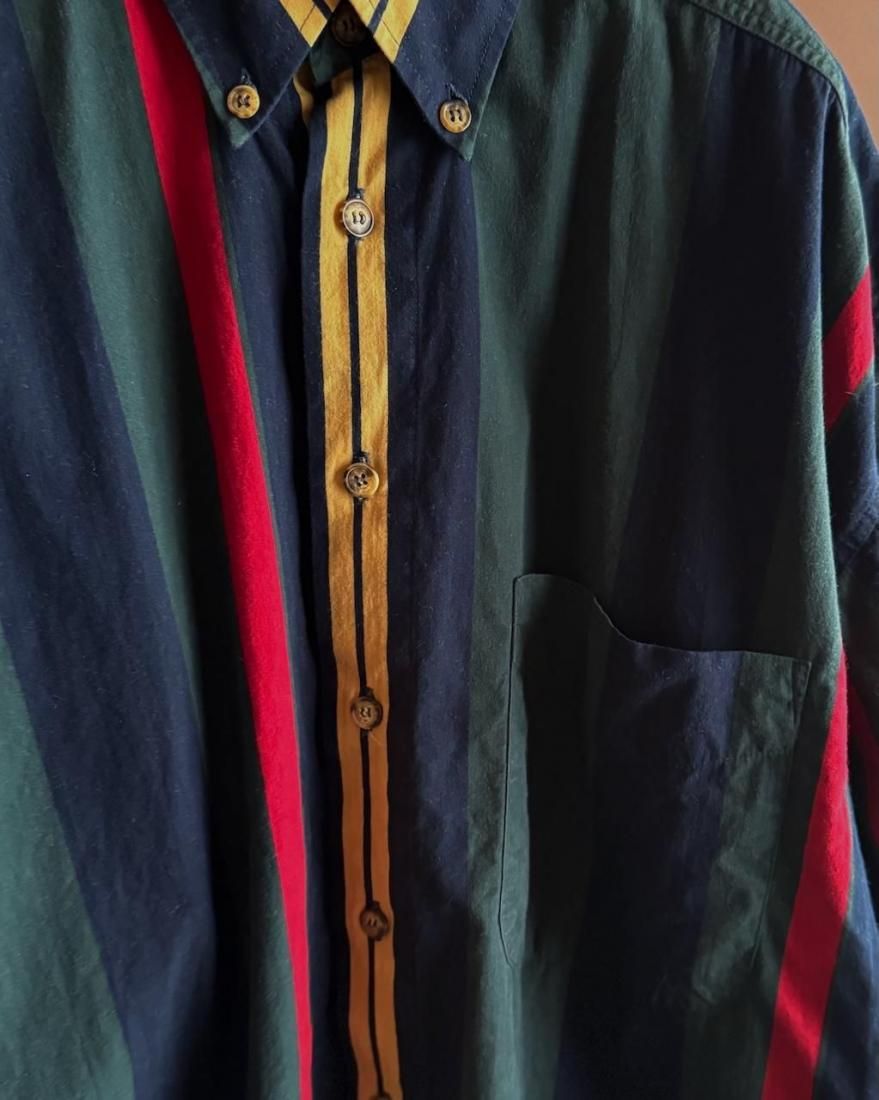 ネイビー、イエロー、グリーン、レッドのトラッドなマルチストライプ柄が素敵なボタンダウンシャツ。