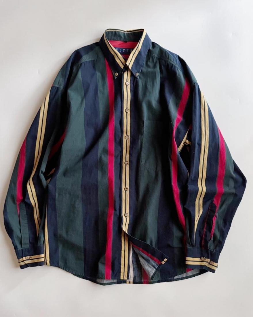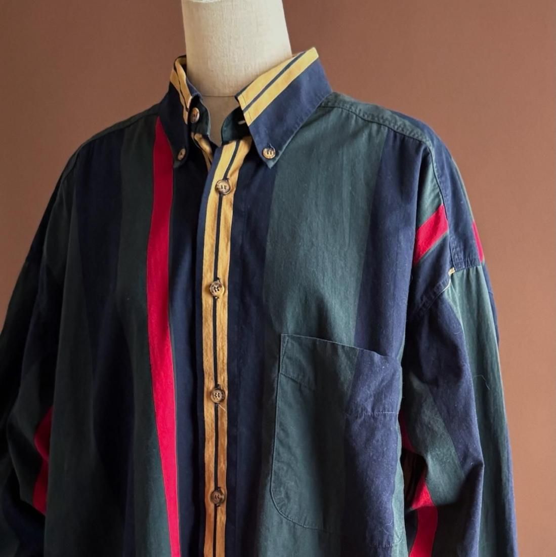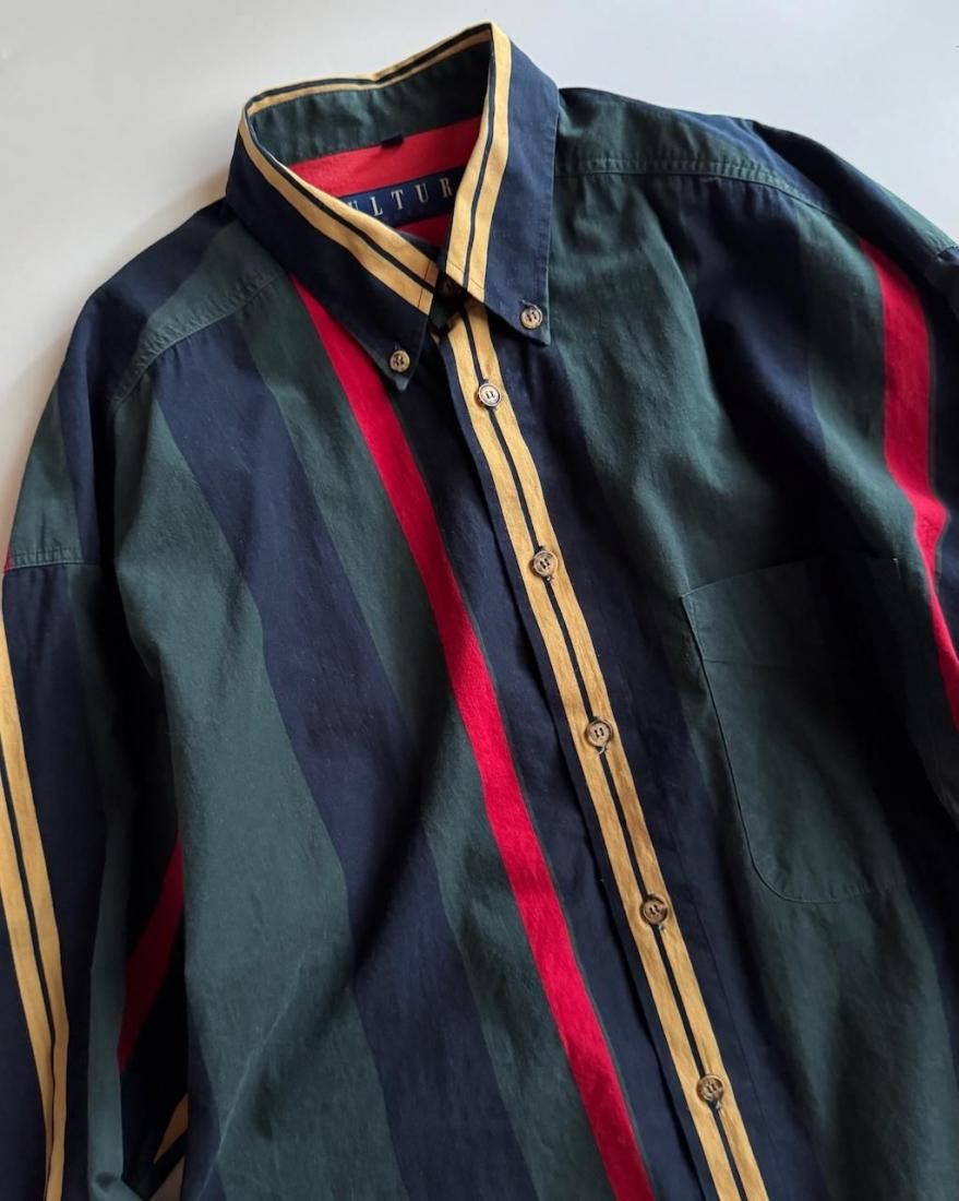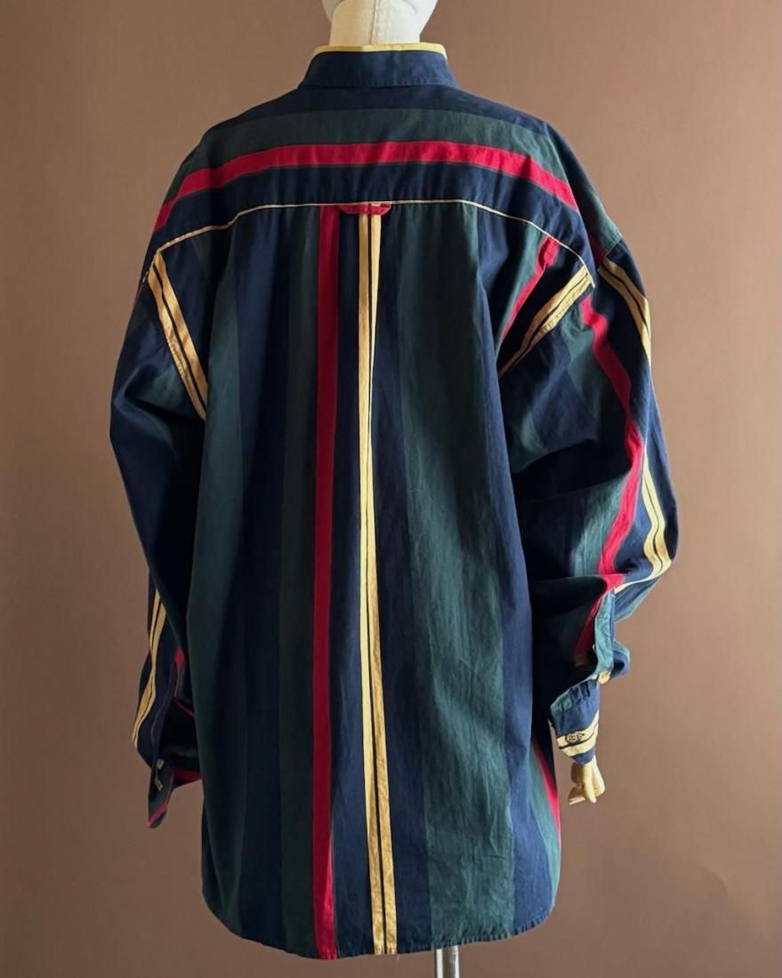 ネイビー、イエロー、グリーン、レッドのトラッドなマルチストライプ柄が素敵なボタンダウンシャツ。