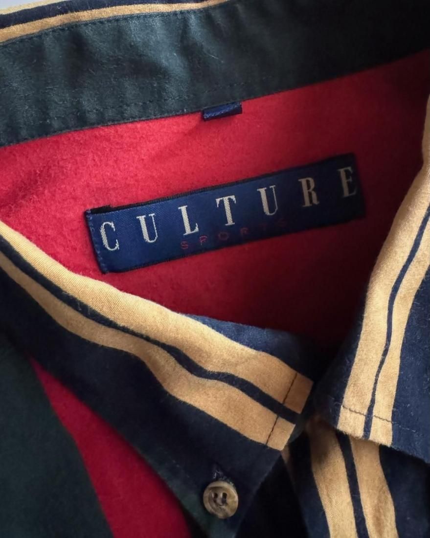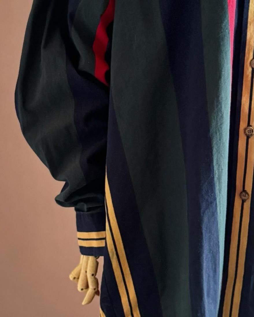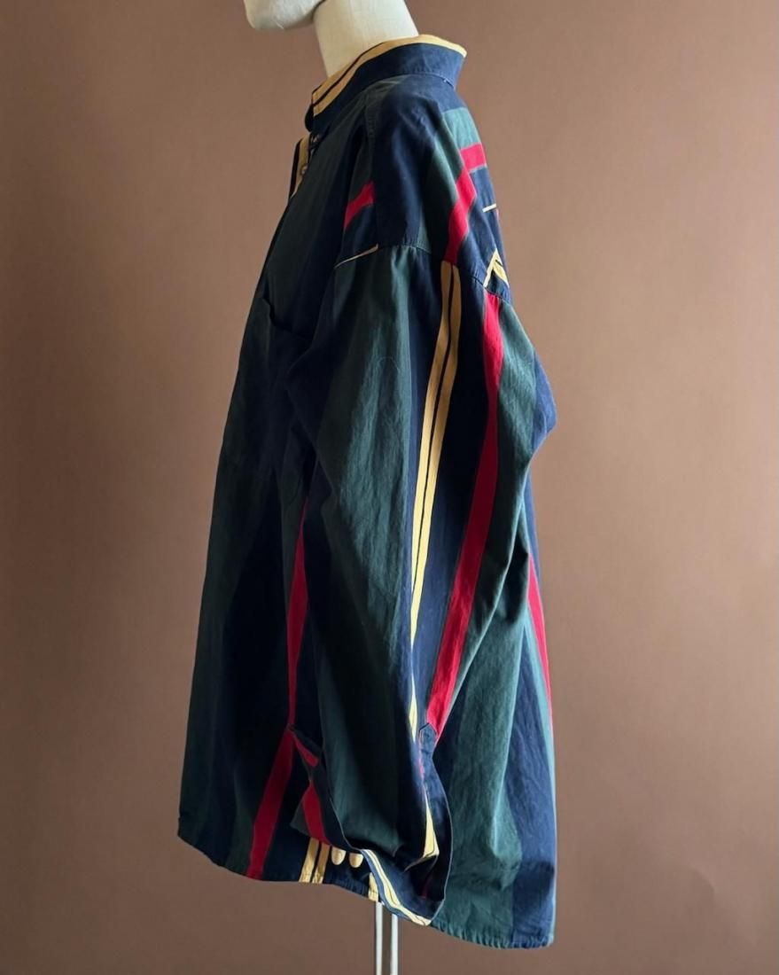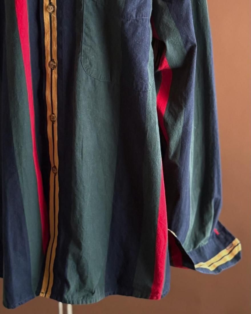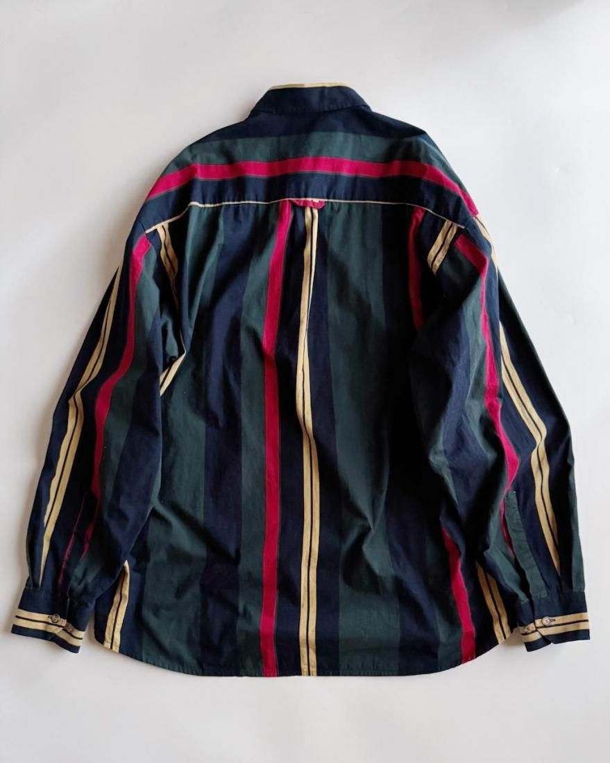 ネイビー、イエロー、グリーン、レッドのトラッドなマルチストライプ柄が素敵なボタンダウンシャツ。